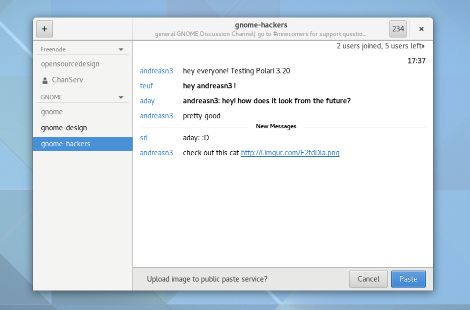 Essa versão 3.20 tem sido um grande lançamento para Polari, a aplicação IRC do GNOME. O recurso de pasta de serviço online que foi introduzido no último lançamento foi substancialmente melhorada: além de ser capaz de colar parágrafos de texto para partilhas, agora é possível também colar imagens diretamente para os chats, a fim de compartilhá-los. A adição de servidores e salas também foi melhorada para essa versão, assim como as configurações do servidor.