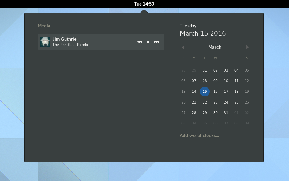 Com GNOME 3.20, controles de mídia estão agora bem mais fáceis, e são exibidos na área de notificação/relógio. Isso fornece uma maneira de acessar rapidamente os aplicativos de músicas e vídeos que estão atualmente em uso. Os controles para múltiplas aplicações multimídia podem ser mostrados ao mesmo tempo.