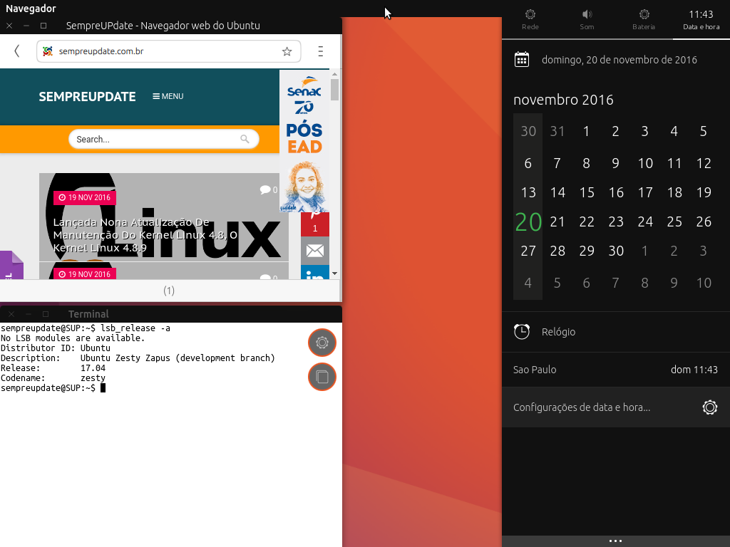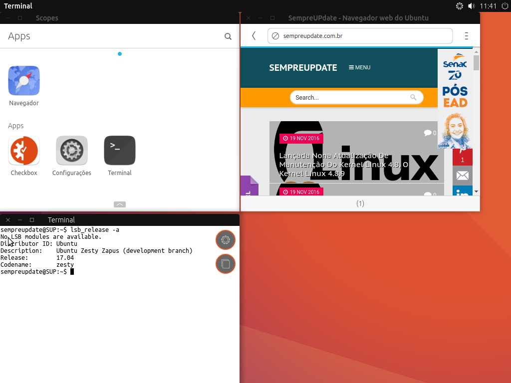 As imagens abaixo mostram o Unity 8 sendo executado no Ubuntu 16.10 Yakkety Yak e no Ubuntu 17.04 Zesty Zapus.