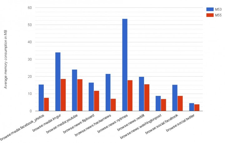 De acordo com informações recentes, o Chrome 55 virá com um novo motor Javascript que tornará o navegador muito mais eficiente e rápido. Segundo os testes já realizados, usando o Chrome 55 em sites como o New York Times, Reddit e YouTube o consumo de RAM é 50% menos quando usado o Chrome 53.