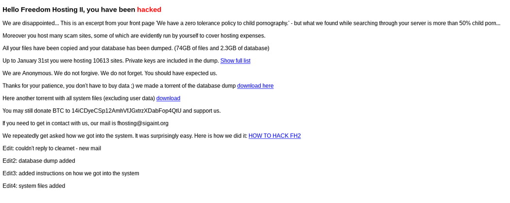 Apenas alguns dias atrás, um grupo de hackers filiado ao Anonymous invadiu os servidores da Freedom Hosting II e retirou mais de 10.000 sites do ar com o seguinte anuncio aos visitantes: