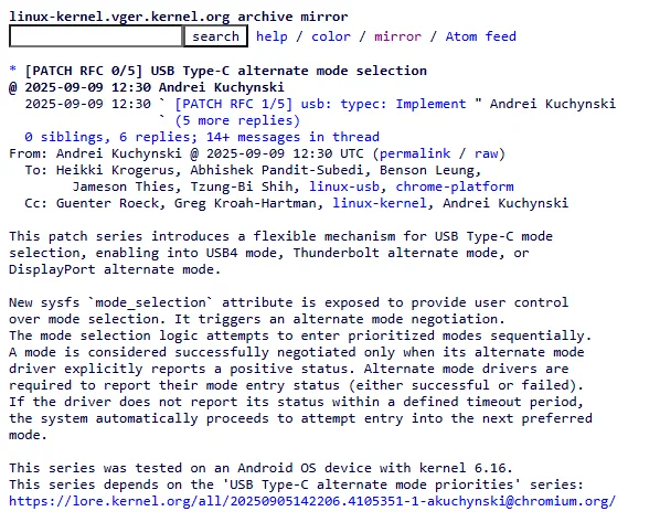 Essa proposta vem “montada” sobre outra série complementar: alternate mode priorities, que adiciona controle de prioridade por altmode (via sysfs) — isto é, quem o sistema prefere primeiro quando há várias possibilidades válidas. Juntas, as duas peças permitem que o kernel execute a seleção de forma estável, mas ainda alinhada às preferências do sistema/política.