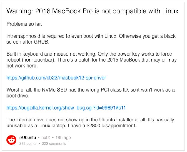 Entretanto, muitos consumidores que adquiriram os novos MacBook Pro e estão substituindo o Mac OS por uma distribuição GNU/Linux, reportaram a impossibilidade da instalação de um sistema GNU/Linux.