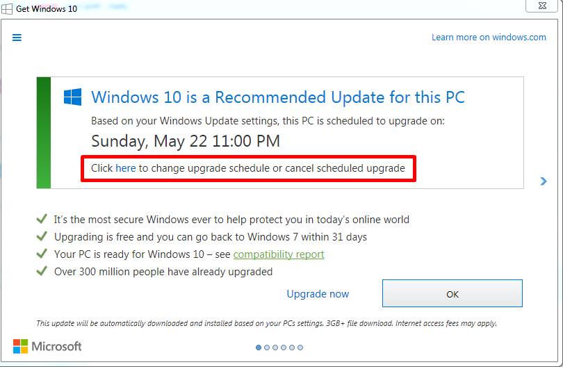 Caso você veja uma mensagem de atualização como a mostrada acima e não queira atualizar seu computador para Windows 10, não clique no X vermelho no canto superior da janela para fechá-la. Isso fará com que a atualização aconteça na data e hora mostradas na janela. Para evitar a atualização, é necessário clicar no local indicado pelo retângulo vermelho na imagem abaixo: